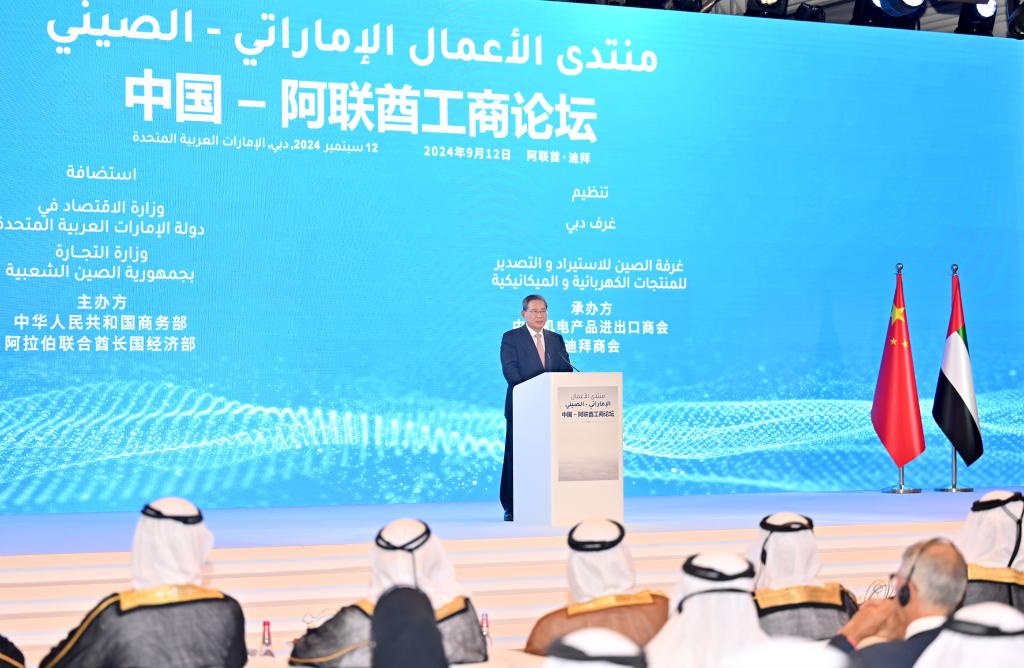 Chinese Premier Li Qiang addresses the UAE-China Business Forum in Dubai, the United Arab Emirates, Sept. 12, 2024. (Xinhua/Yao Dawei)