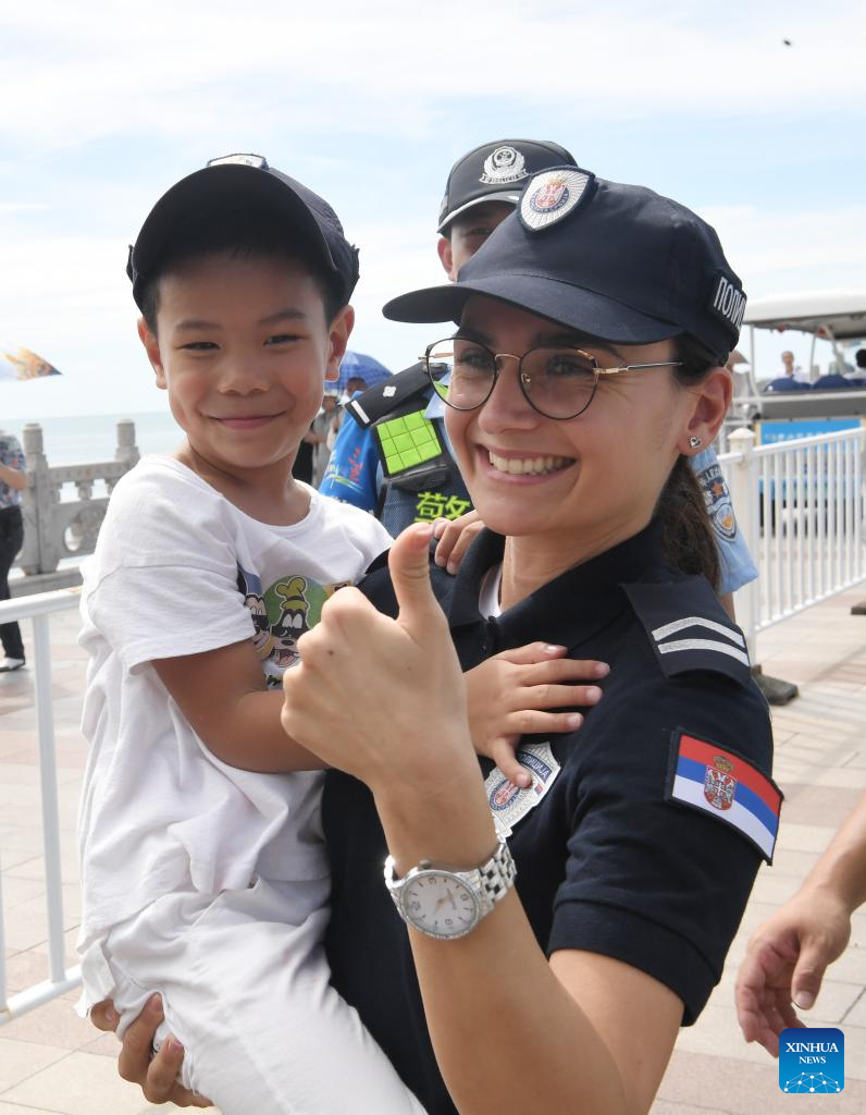 A Serbian police officer poses for a photo with a Chinese boy while patrolling at the Nanshan Cultural Tourism Zone in Sanya, south China's Hainan Province, Sept. 12, 2024. At the invitation of China's Ministry of Public Security, six police officers from Serbia came to China for a one-month joint police patrol mission, according to the authority.