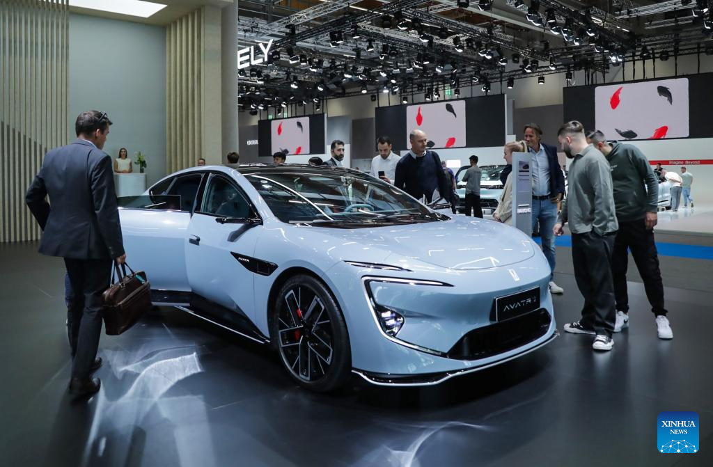 People visit the booth of AVATR at the Automechanika in Frankfurt, Germany, Sept. 11, 2024. A leading trade fair for the aftermarket sector of the auto industry, Automechanika, kicked off on Tuesday, highlighting electrification and sustainability.