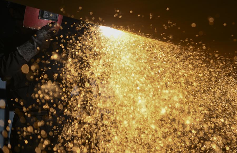 A worker welds at a wind power equipment manufacturing enterprise at the high-tech industrial development zone in Hami City, northwest China's Xinjiang Uygur Autonomous Region, Sept. 10, 2024. (Xinhua/Hu Huhu)