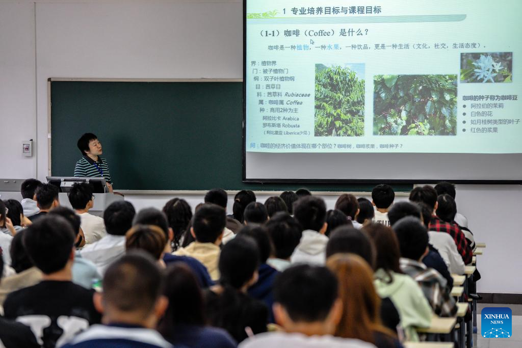 A teacher gives a coffee-themed lecture at the College of Tropical Crops of Yunnan Agricultural University (YAU) in Pu'er City in the southwest Yunnan Province, Sept. 10, 2024. (Xinhua/Hu Chao)