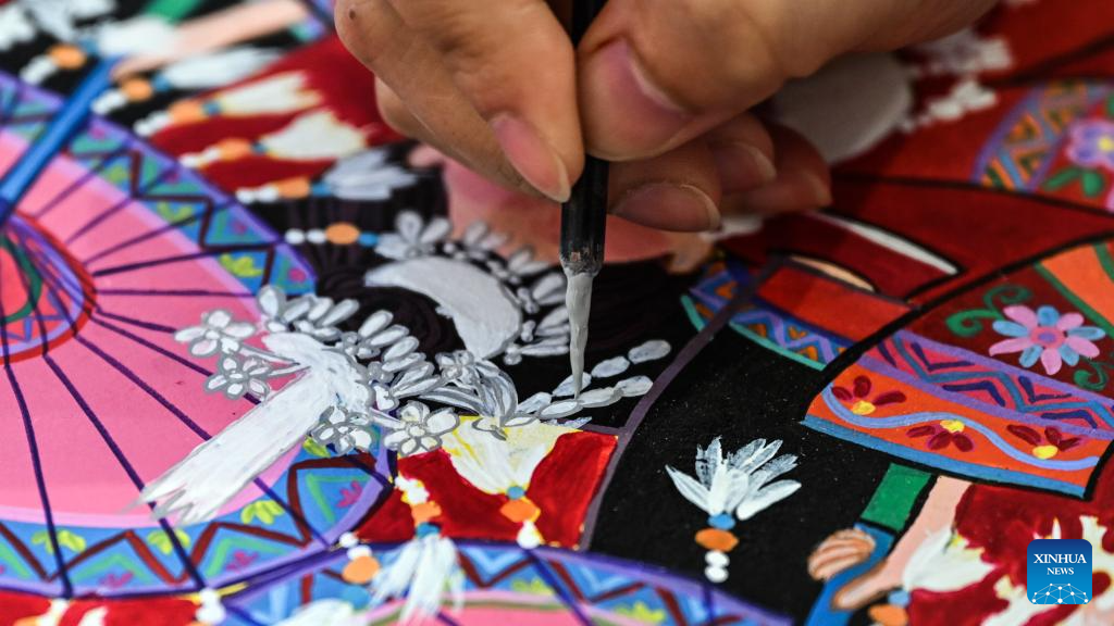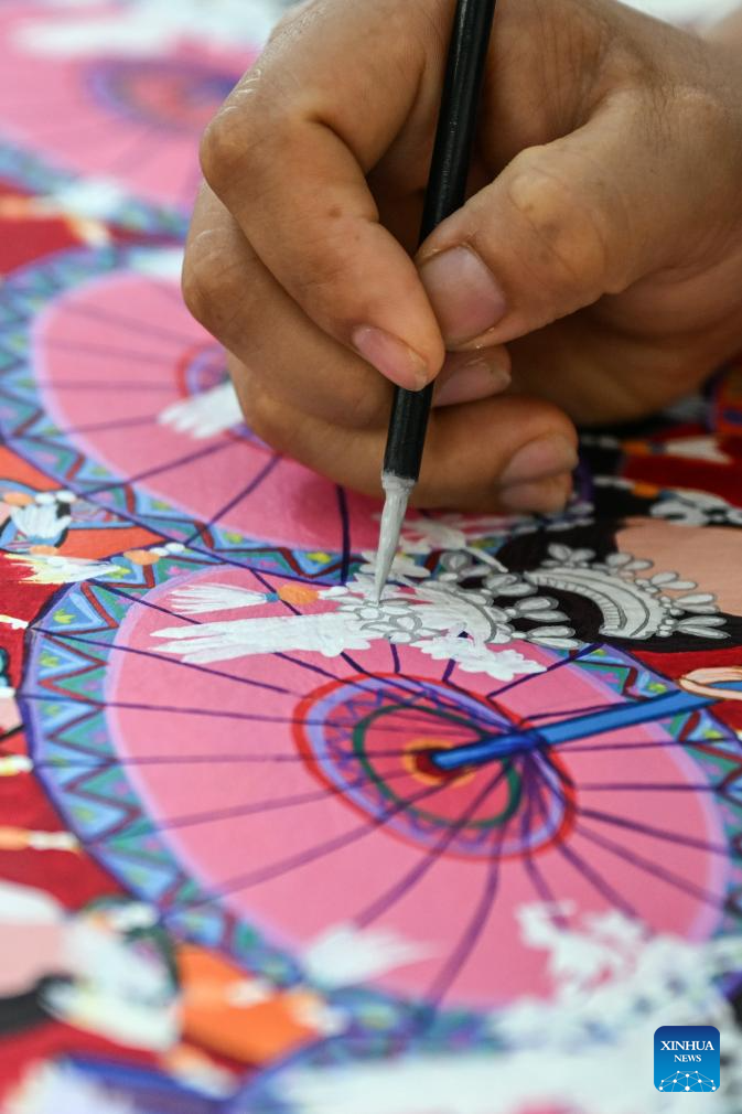 Farmer artist Chen Meimei works on a painting at a workshop in Sanjiang Dong Autonomous County of Liuzhou, south China's Guangxi Zhuang Autonomous Region, Sept. 11, 2024. An exhibition displaying farmer paintings kicked off here Thursday. In Sanjiang Dong Autonomous County of Liuzhou, more than 600 farmer artists are engaged in the painting industry. (Xinhua/Zhang Ailin)