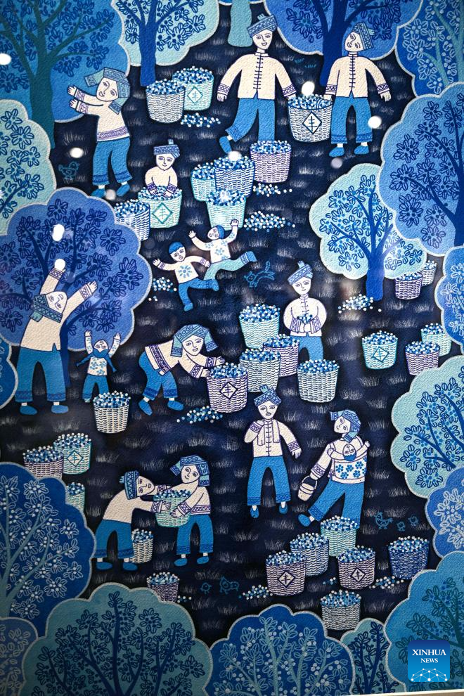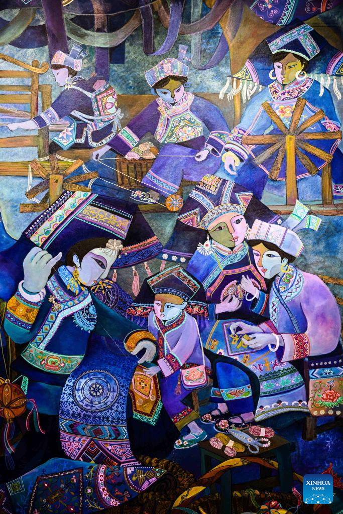 This photo taken on Sept. 12, 2024 shows a painting created by farmer artist from Sanjiang Dong Autonomous County at an exhibition in Liuzhou, south China's Guangxi Zhuang Autonomous Region. An exhibition displaying farmer paintings kicked off here Thursday. In Sanjiang Dong Autonomous County of Liuzhou, more than 600 farmer artists are engaged in the painting industry. (Xinhua/Zhang Ailin)