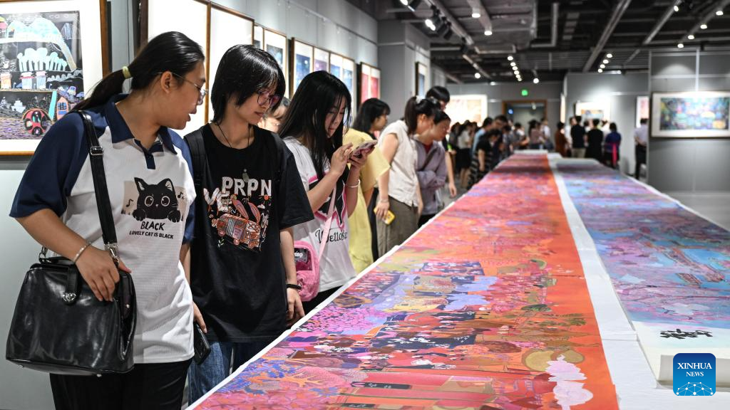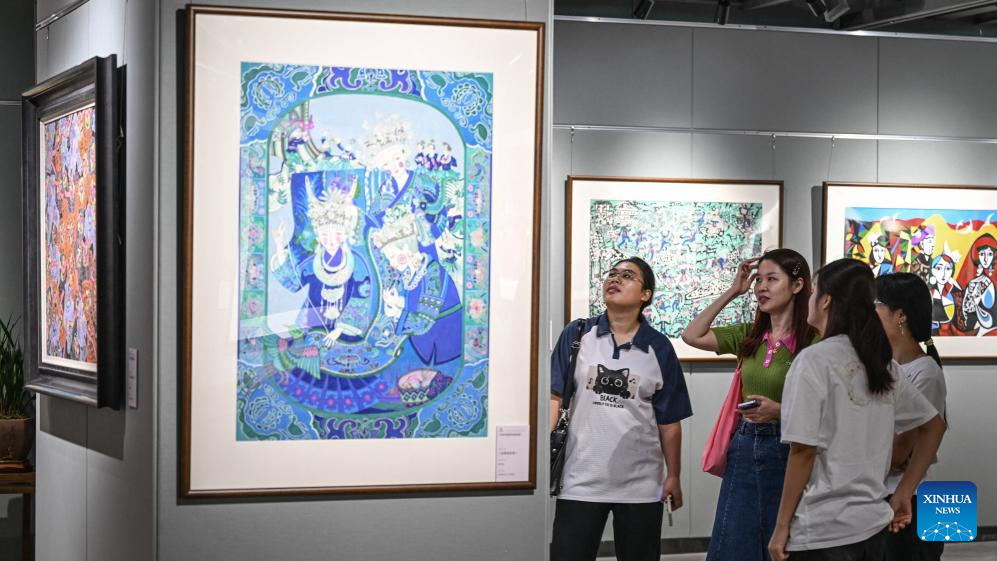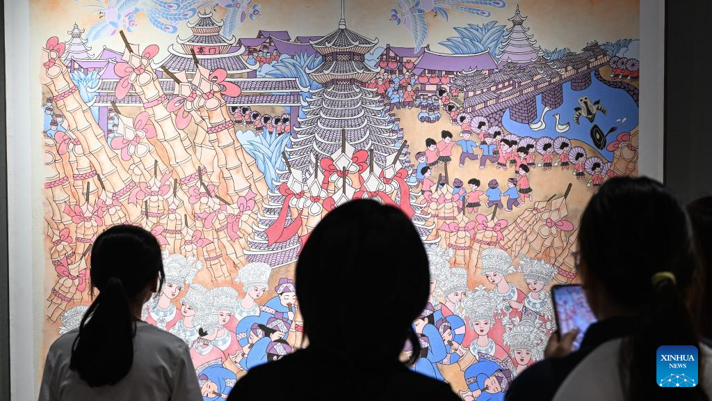 Visitors view paintings created by farmer artists from Sanjiang Dong Autonomous County at an exhibition in Liuzhou, south China's Guangxi Zhuang Autonomous Region, Sept. 12, 2024. An exhibition displaying farmer paintings kicked off here Thursday. In Sanjiang Dong Autonomous County of Liuzhou, more than 600 farmer artists are engaged in the painting industry. (Xinhua/Zhang Ailin)