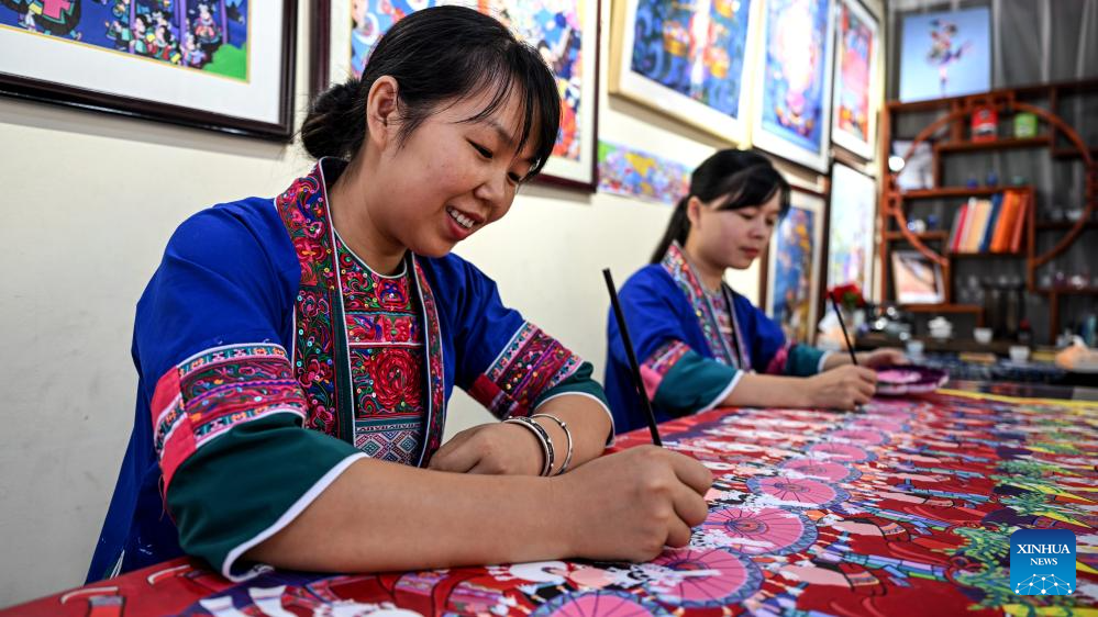 Farmer artists Chen Meimei (L) and Rong Xuelian work on a painting at a workshop in Sanjiang Dong Autonomous County of Liuzhou, south China's Guangxi Zhuang Autonomous Region, Sept. 11, 2024. An exhibition displaying farmer paintings kicked off here Thursday. In Sanjiang Dong Autonomous County of Liuzhou, more than 600 farmer artists are engaged in the painting industry. (Xinhua/Zhang Ailin)