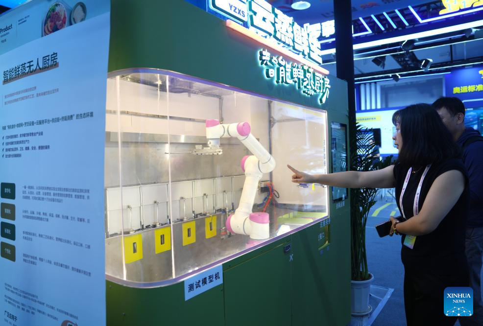 An exhibitor introduces an intelligent kitchen to a visitor at an innovation achievements exhibition of the 2024 Global Industrial Internet Conference in Shenyang, northeast China's Liaoning Province, Sept. 12, 2024. The 2024 Global Industrial Internet Conference kicked off here on Thursday. (Xinhua/Zhang Lei)
