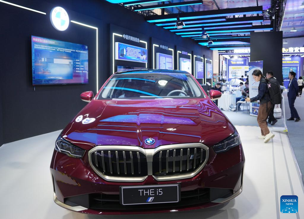 A BMW i5 electric car produced by BMW Brilliance Automotive (BBA) is displayed at an innovation achievements exhibition of the 2024 Global Industrial Internet Conference in Shenyang, northeast China's Liaoning Province, Sept. 12, 2024. The 2024 Global Industrial Internet Conference kicked off here on Thursday. (Xinhua/Zhang Lei)