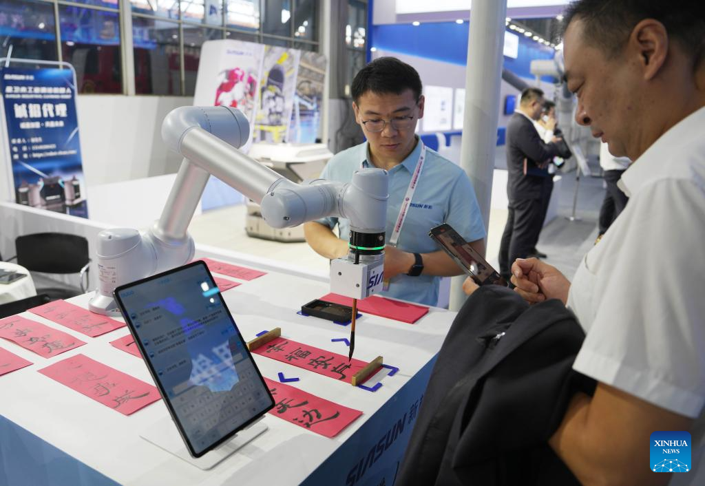 Visitors watch as a robot writes calligraphy at an innovation achievements exhibition of the 2024 Global Industrial Internet Conference in Shenyang, northeast China's Liaoning Province, Sept. 12, 2024. The 2024 Global Industrial Internet Conference kicked off here on Thursday. (Xinhua/Zhang Lei)