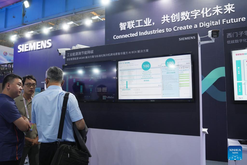 People visit the booth of Siemens at an innovation achievements exhibition of the 2024 Global Industrial Internet Conference in Shenyang, northeast China's Liaoning Province, Sept. 12, 2024. The 2024 Global Industrial Internet Conference kicked off here on Thursday. (Xinhua/Zhang Lei)