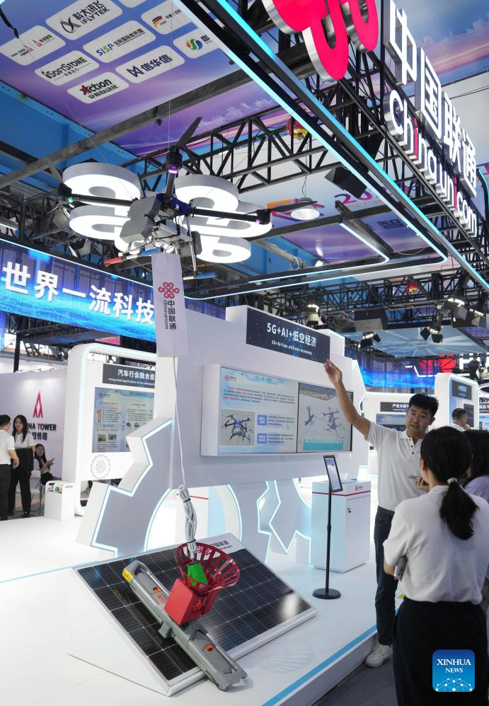 An exhibitor introduces an unmanned cleaning robot for photovoltaic panels to visitors at an innovation achievements exhibition of the 2024 Global Industrial Internet Conference in Shenyang, northeast China's Liaoning Province, Sept. 12, 2024. The 2024 Global Industrial Internet Conference kicked off here on Thursday. (Xinhua/Zhang Lei)