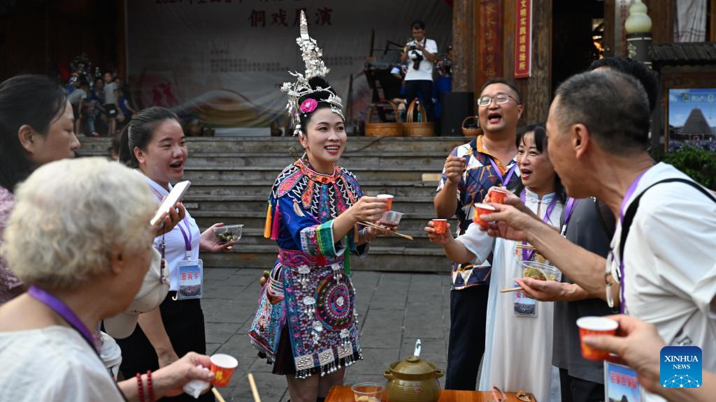 People of the Dong ethnic group present liquor to tourists in a ceremonial way in Chengyang Eight Villages in Sanjiang Dong Autonomous County, south China's Guangxi Zhuang Autonomous Region, Aug. 28, 2024.(Xinhua/Zhang Ailin)
