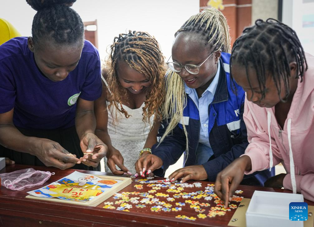People do a jigsaw puzzle during a Mid-Autumn Festival celebration in Nairobi, Kenya, on Sept. 13, 2024. Africa Star Railway Operation Company (Afristar), the operator of Kenya's Standard Gauge Railway (SGR), and the Confucius Institute at the University of Nairobi, Kenya's oldest university, on Friday partnered to host the upcoming Mid-Autumn Festival, one of China's most important traditional holidays. (Xinhua/Li Yahui)