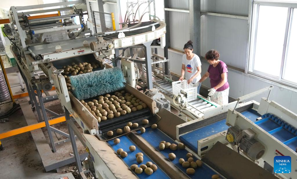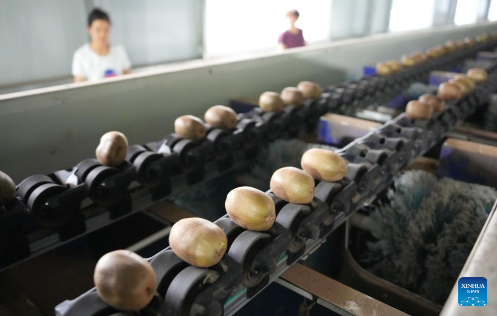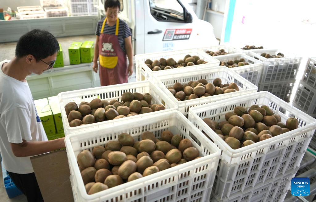 Workers sort kiwi fruits in Yuanquan Town, Boshan District, Zibo City in east China's Shandong Province, Sept. 12, 2024. Recently, Boshan District is witnessing the harvest season of 20,000 mu (about 1,333 hectares) of kiwi fruits. (Xinhua/Xu Suhui)