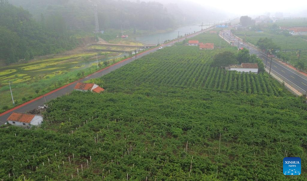 An aerial drone photo taken on Sept. 12, 2024 shows a view of the kiwi planting base in Yuanquan Town, Boshan District, Zibo City in east China's Shandong Province. Recently, Boshan District is witnessing the harvest season of 20,000 mu (about 1,333 hectares) of kiwi fruits. (Xinhua/Xu Suhui)