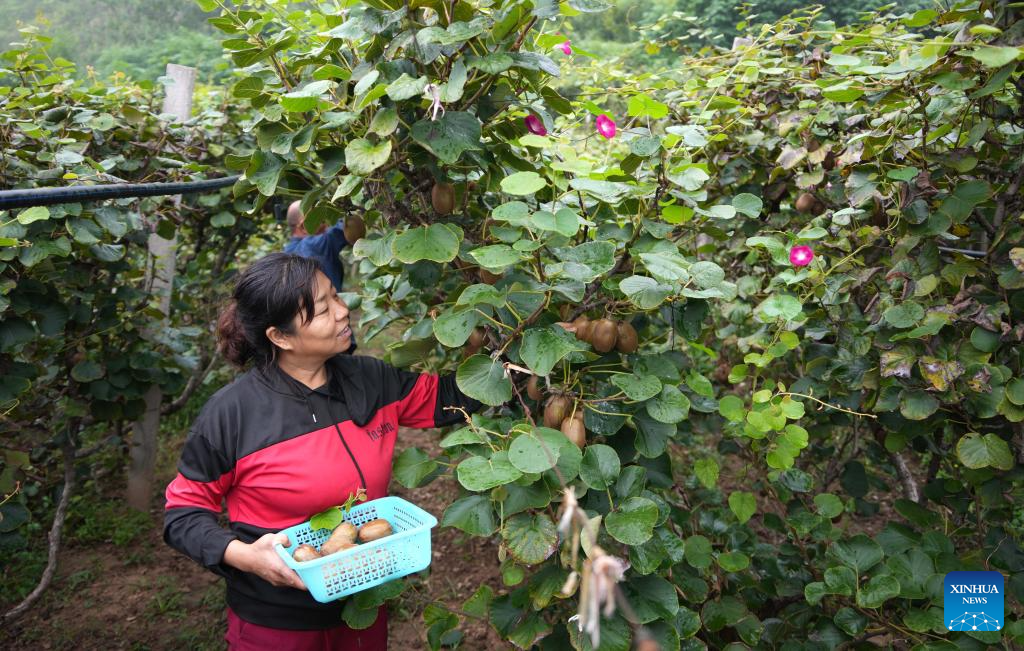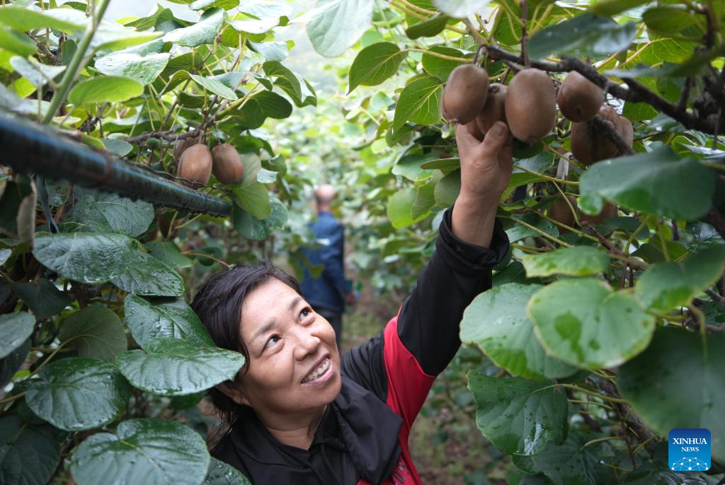 A villager picks kiwi fruits at a planting base in Yuanquan Town, Boshan District, Zibo City in east China's Shandong Province, Sept. 12, 2024. Recently, Boshan District is witnessing the harvest season of 20,000 mu (about 1,333 hectares) of kiwi fruits. (Xinhua/Xu Suhui)