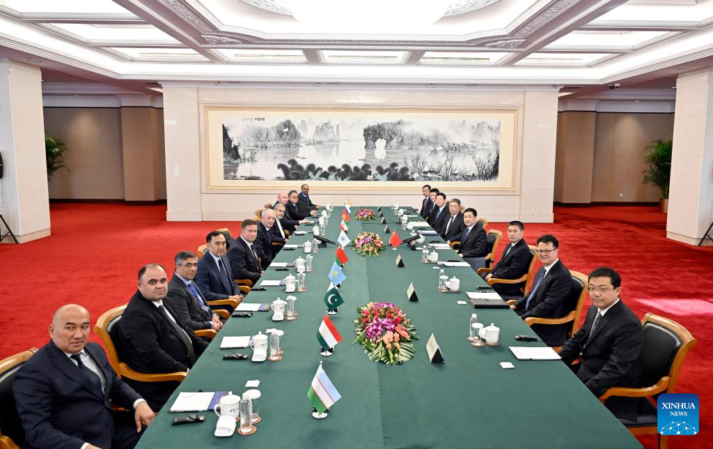 Chinese State Councilor and Minister of Public Security Wang Xiaohong meets with heads of delegations of the 42nd meeting of the Council of the Regional Anti-Terrorist Structure (RATS) of the Shanghai Cooperation Organization (SCO) in Beijing, capital of China, Sept. 13, 2024. (Xinhua/Yin Bogu)
