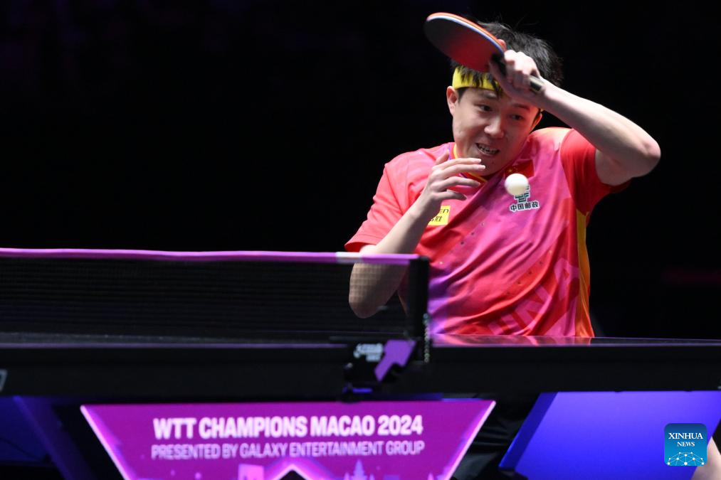 Wang Chuqin of China hits a return during the men's singles quarterfinal match between Wang Chuqin of China and Cho Daeseong of South Korea at the 2024 World Table Tennis (WTT) Champions Macao in Macao, south China, Sept. 13, 2024. (Xinhua/Cheong Kam Ka)