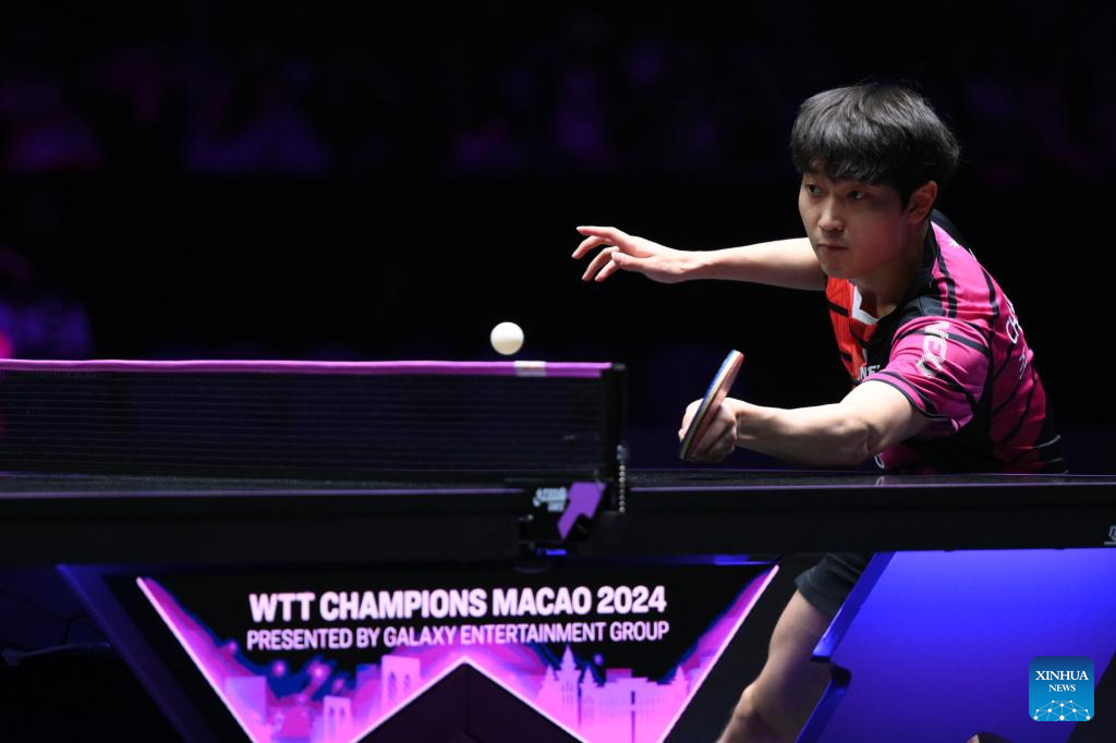 Cho Daeseong of South Korea hits a return during the men's singles quarterfinal match between Wang Chuqin of China and Cho Daeseong of South Korea at the 2024 World Table Tennis (WTT) Champions Macao in Macao, south China, Sept. 13, 2024. (Xinhua/Cheong Kam Ka)