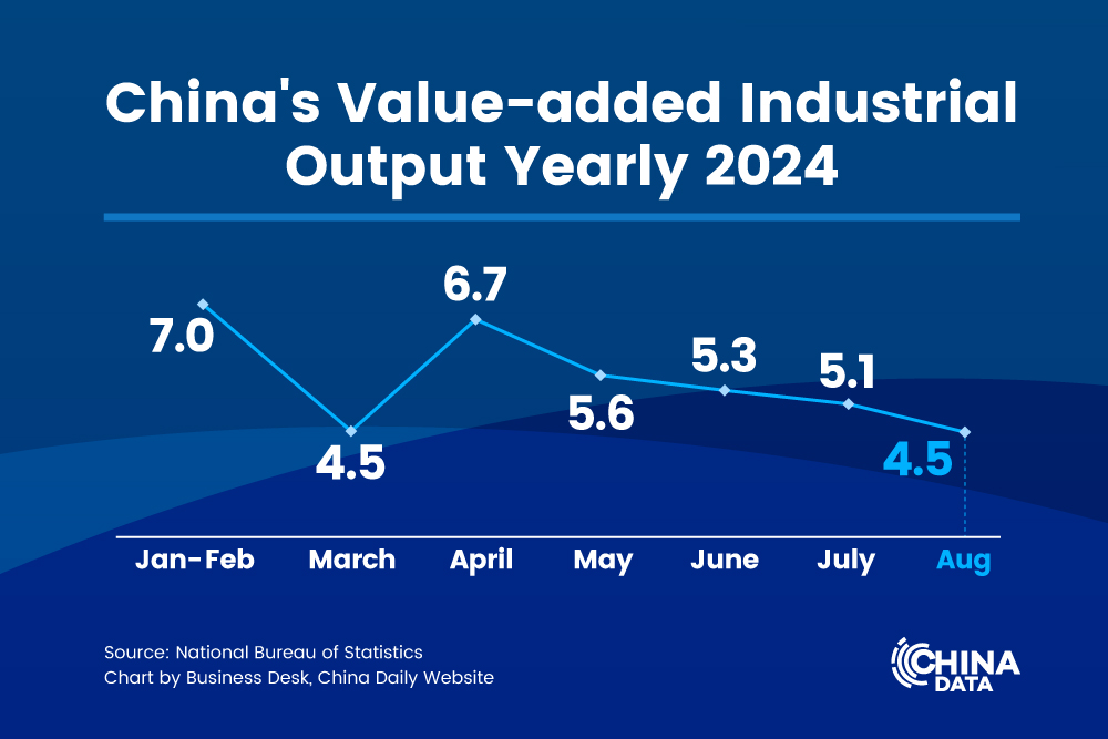 China's value-added industrial output, an important economic indicator, went up 4.5 percent year-on-year in August, according to the National Bureau of Statistics on Saturday.