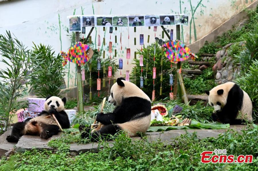 Giant pandas enjoy a special birthday cake during a group party at the Bifengxia Giant Panda Base in Ya'an, southwest China's Sichuan Province, Sept. 13, 2024. (Photo: China News Service/An Yuan)