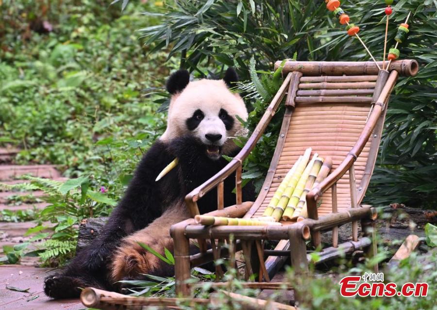 A giant panda enjoys bamboo shoots during a group birthday party at the Bifengxia Giant Panda Base in Ya'an, southwest China's Sichuan Province, Sept. 13, 2024. (Photo: China News Service/An Yuan)