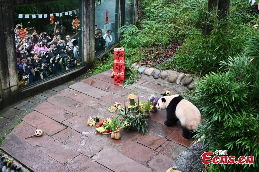 A giant panda enjoys a special birthday cake during a group party at the Bifengxia Giant Panda Base in Ya'an, southwest China's Sichuan Province, Sept. 13, 2024. (Photo: China News Service/An Yuan)