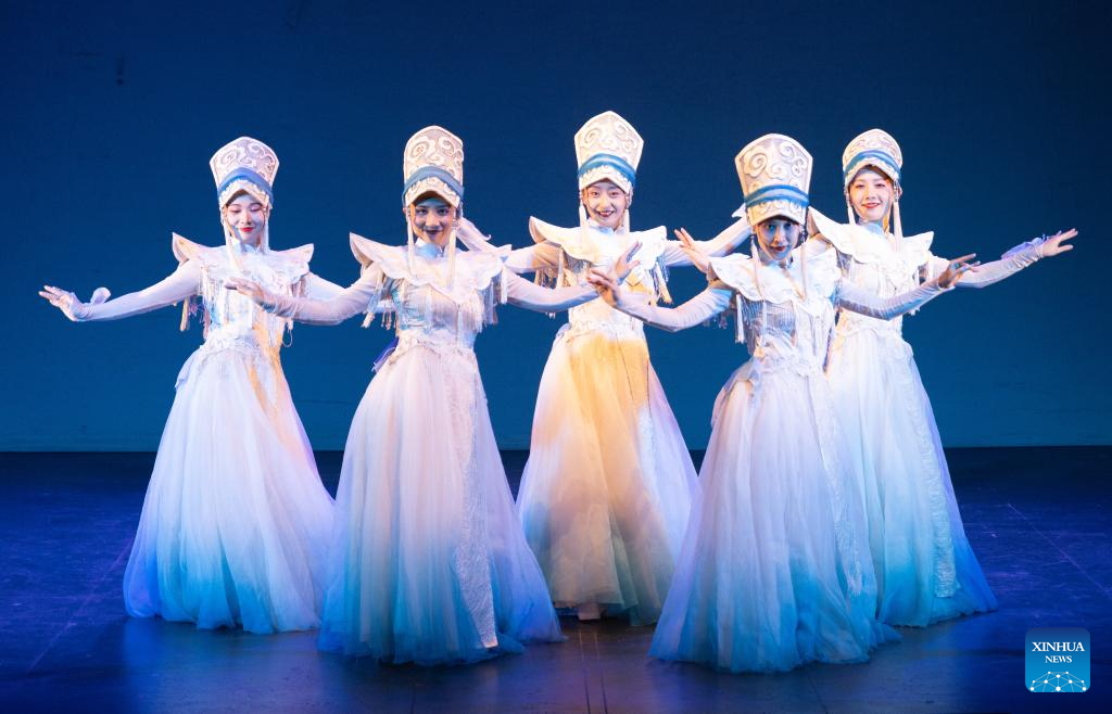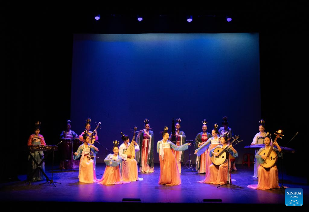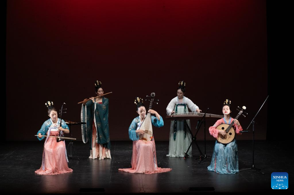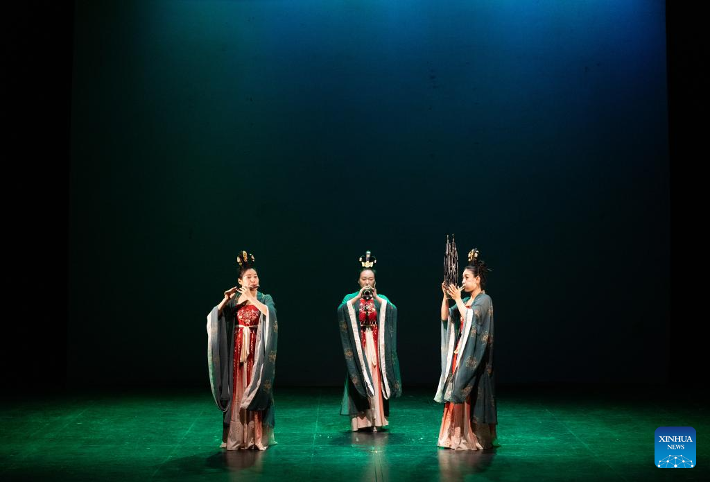 Actresses perform at a celebration event, dubbed "Ode to the Moon," in Mexico City, Mexico, Sept. 12, 2024. The celebration, hosted by the China Culture Center in Mexico City and Sichuan Provincial Department of Culture and Tourism, lasted from Sept. 11 to 13, during which the Sichuan Symphony Orchestra and the Opera and Dance Theater of Sichuan Province staged wonderful performances. (Xinhua/Li Mengxin)