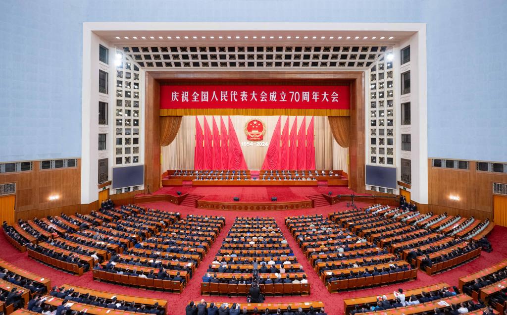 A meeting is held to celebrate the 70th founding anniversary of the National People's Congress (NPC) at the Great Hall of the People in Beijing, capital of China, Sept. 14, 2024. (Xinhua/Zhai Jianlan)