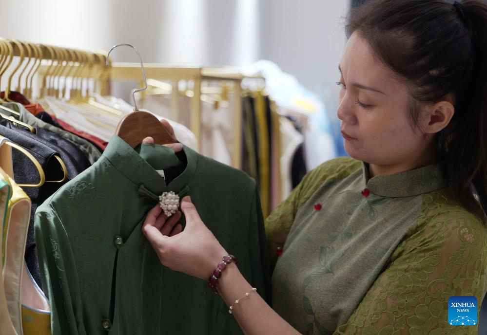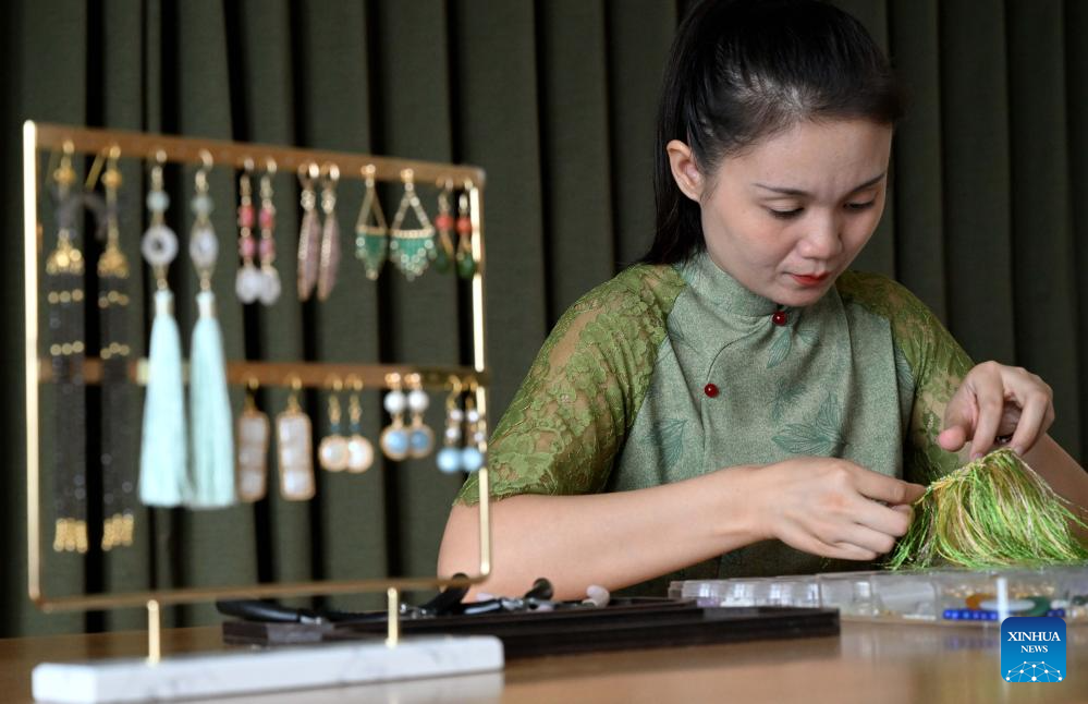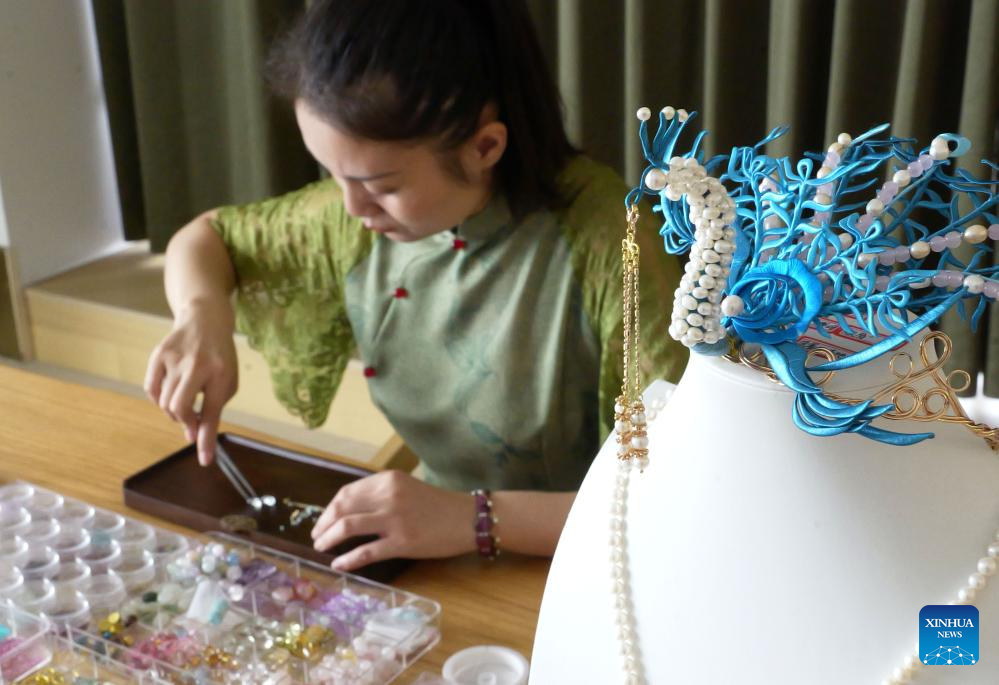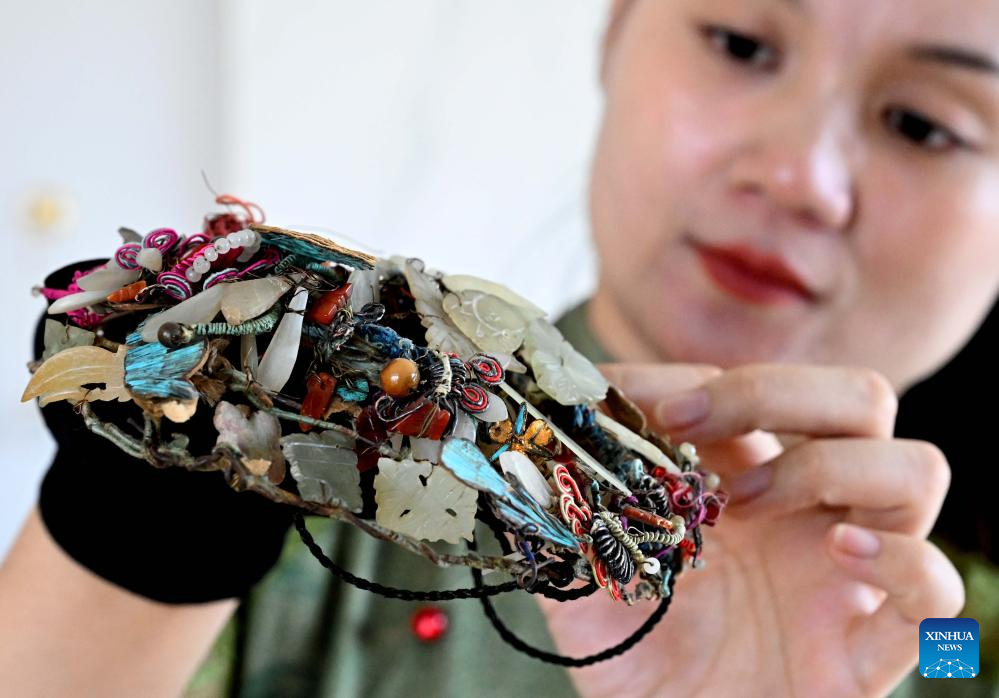 Chu Mengdan accessorizes a brooch at an intangible cultural heritage experience hall in Luoyang City, central China's Henan Province, Sept. 12, 2024. (Xinhua/Li Jianan)