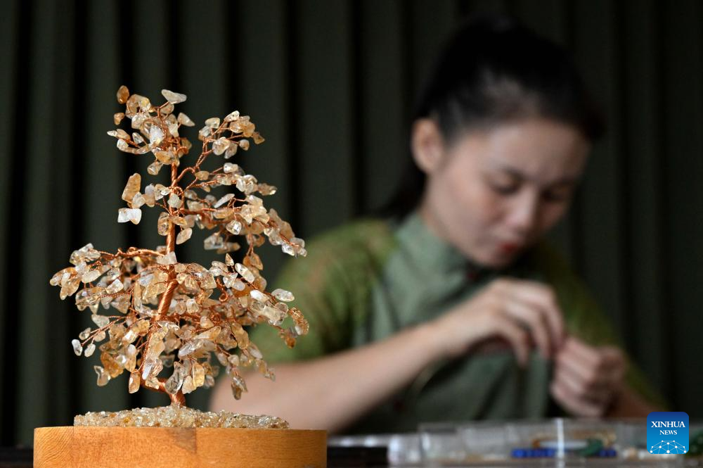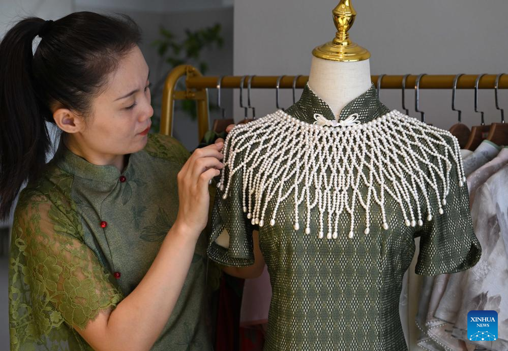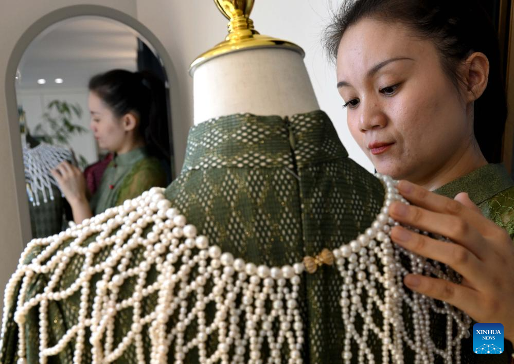 Chu Mengdan checks bead weaving handicrafts at an intangible cultural heritage experience hall in Luoyang City, central China's Henan Province, Sept. 12, 2024. Chu Mengdan is the fourth generation inheritor of bead weaving skills, an intangible cultural heritage project in Chanhe District of Luoyang. The art of stitching and joining beads as small as rice grains to form unique patterns or shapes is called bead weaving, which is used in clothing and jewelry.