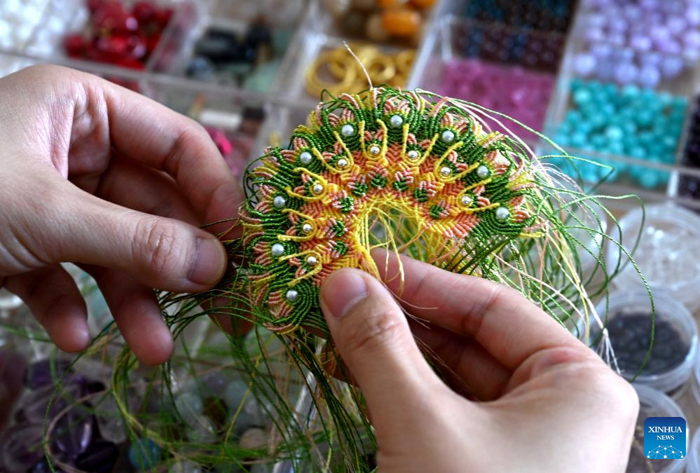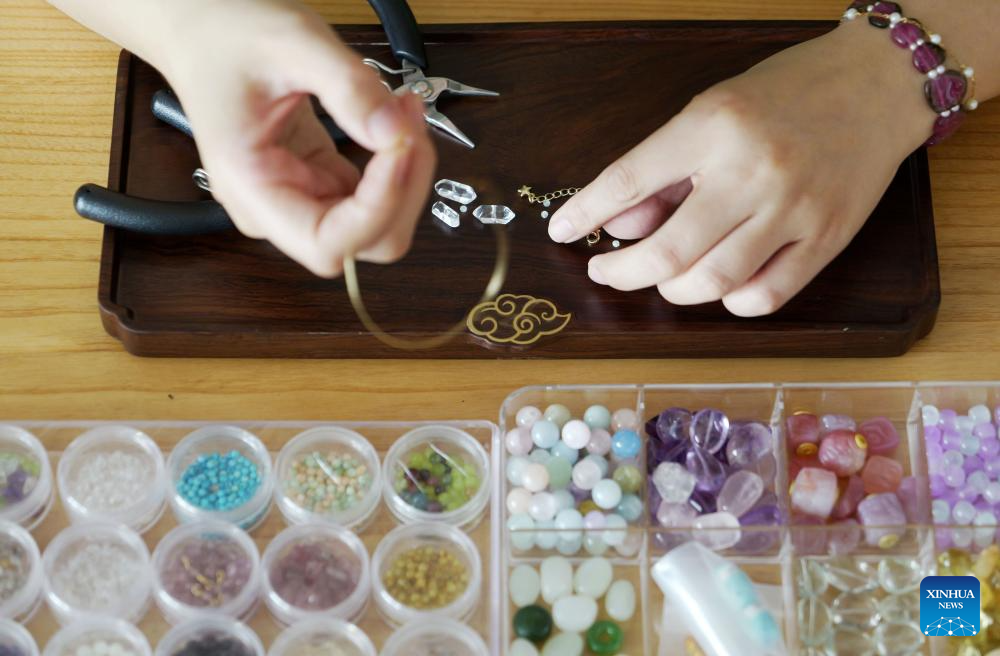 Chu Mengdan makes bead weaving handicrafts at an intangible cultural heritage experience hall in Luoyang City, central China's Henan Province, Sept. 12, 2024. (Xinhua/Li Jianan)