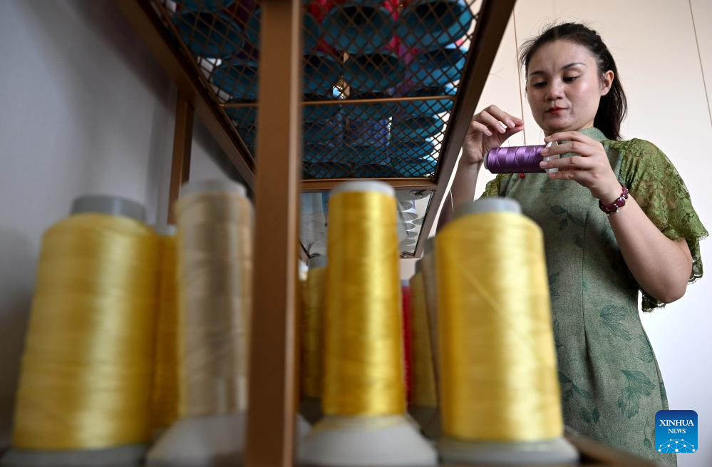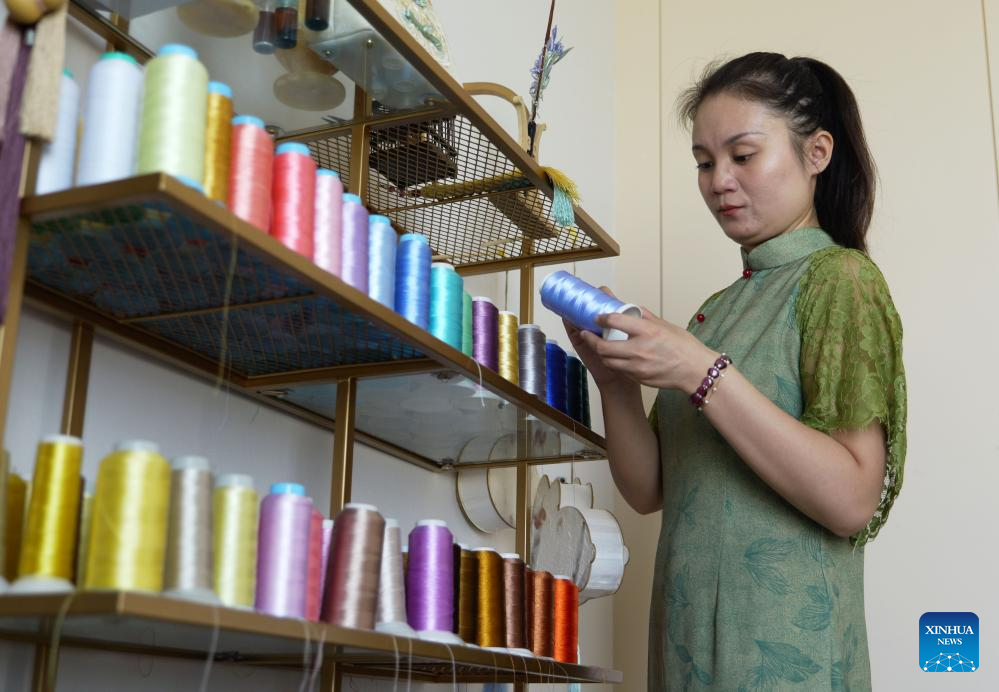 Chu Mengdan selects threads for color matching at an intangible cultural heritage experience hall in Luoyang City, central China's Henan Province, Sept. 12, 2024. (Xinhua/Li Jianan)