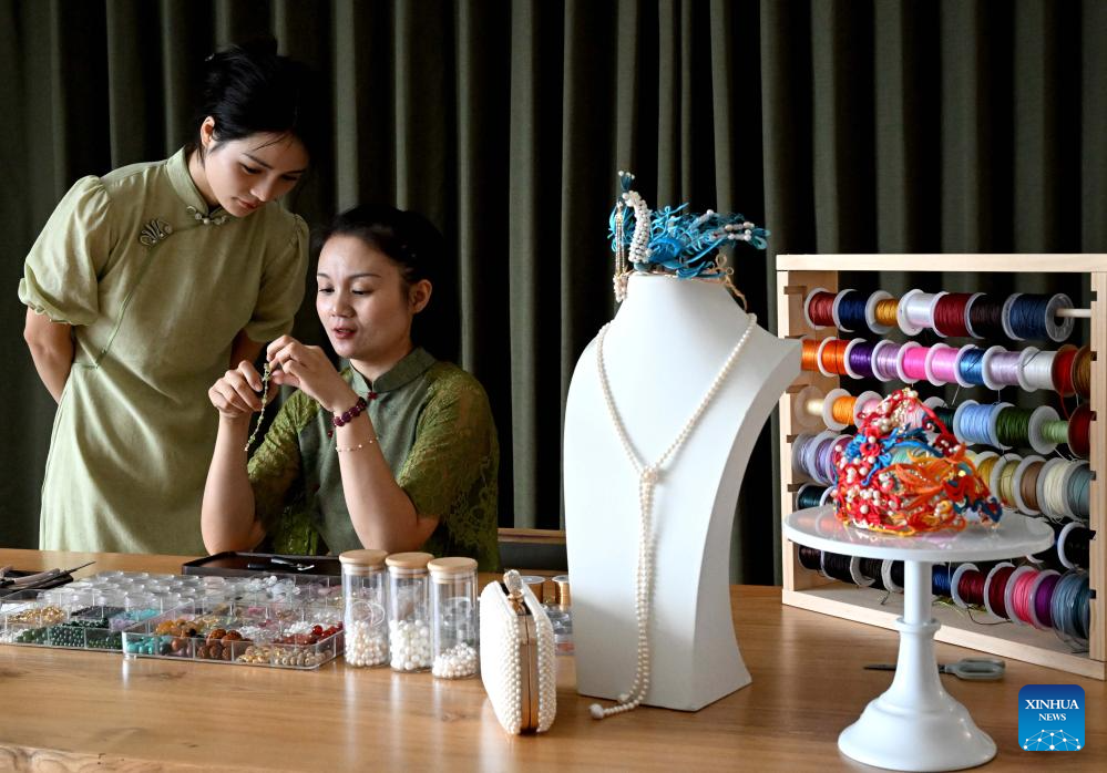 Chu Mengdan checks bead weaving handicrafts at an intangible cultural heritage experience hall in Luoyang City, central China's Henan Province, Sept. 12, 2024. (Xinhua/Li An)