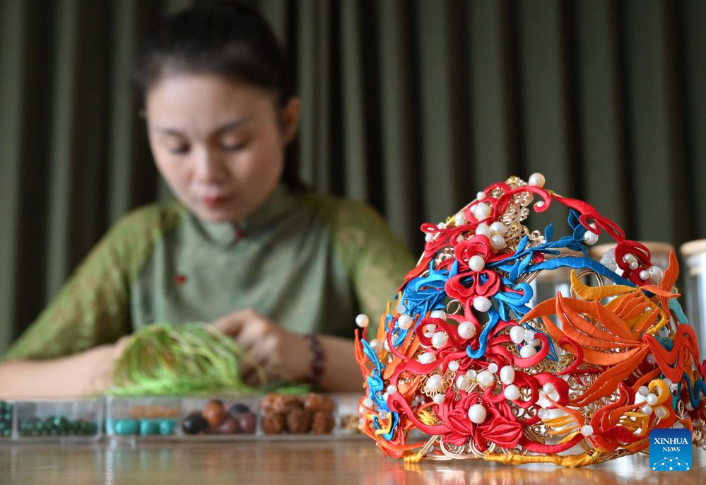 Chu Mengdan makes bead weaving handicrafts at an intangible cultural heritage experience hall in Luoyang City, central China's Henan Province, Sept. 12, 2024. (Xinhua/Li An)