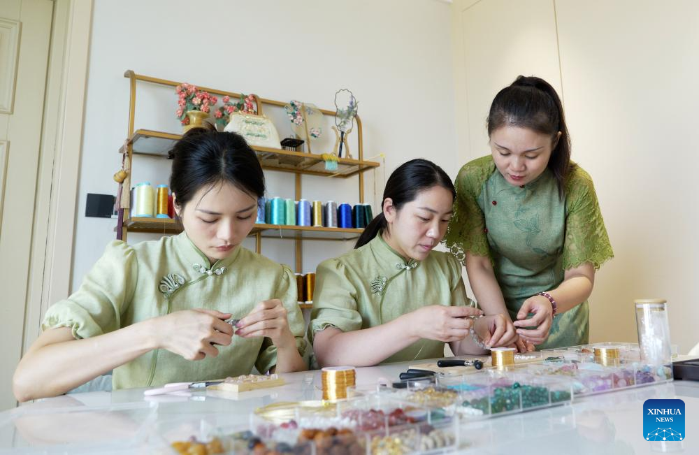 Chu Mengdan (1st R) instructs her apprentices bead weaving at an intangible cultural heritage experience hall in Luoyang City, central China's Henan Province, Sept. 12, 2024. (Xinhua/Li Jianan)