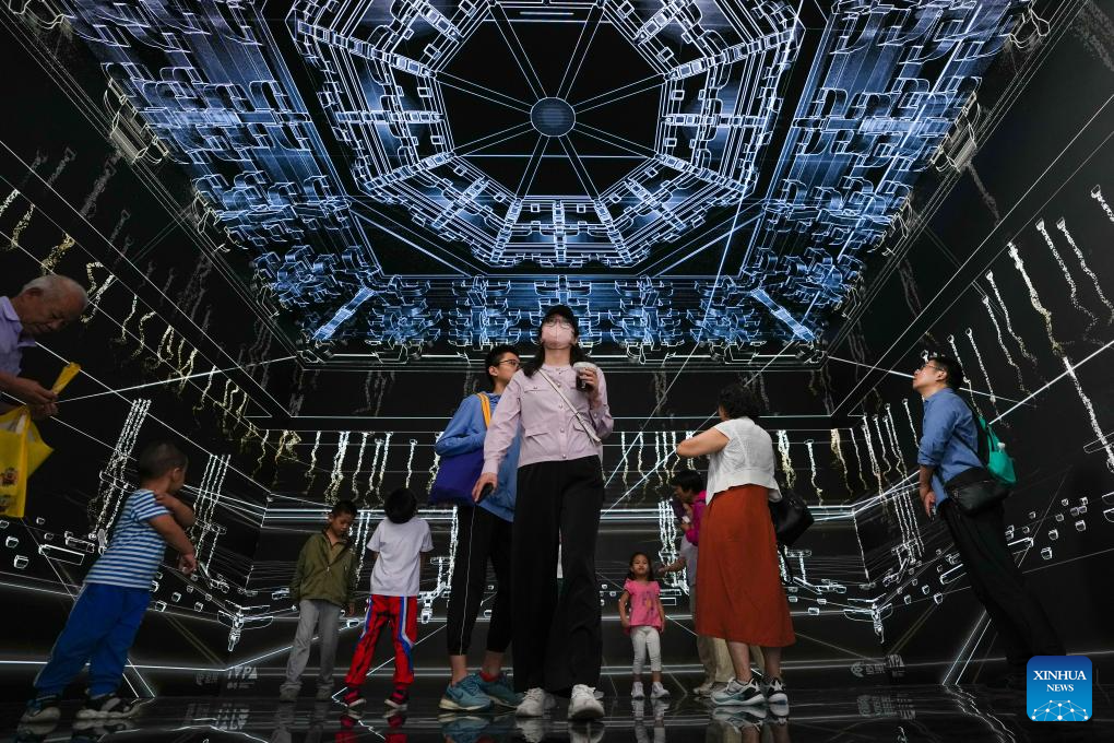 Visitors look at a digital image of the Beijing Central Axis during the 2024 China International Fair for Trade in Services (CIFTIS) in the Cultural &Tourism Service thematic exhibition area at the Shougang Park in Beijing, capital of China, Sept. 16, 2024. The Cultural &Tourism Service thematic exhibition area of this year's CIFTIS reflects the integration of technology and culture. The exhibitions enable multidimensional presentations with new technologies such as immersive digital spaces, virtual reality (VR), augmented reality (AR), and holographic projection. (Xinhua/Ding Hongfa)