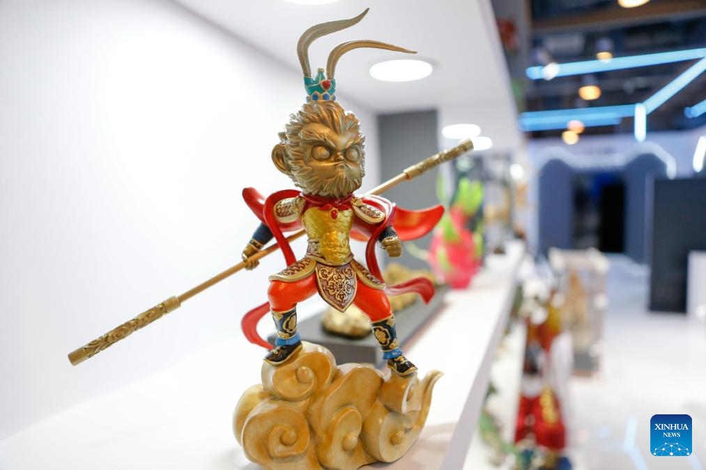 A creative cultural product themed on Chinese mythological figure the Monkey King or Sun Wukong, is pictured during the 2024 China International Fair for Trade in Services (CIFTIS) at the China National Convention Center in Beijing, capital of China, Sept. 12, 2024. The Cultural &Tourism Service thematic exhibition area of this year's CIFTIS reflects the integration of technology and culture. The exhibitions enable multidimensional presentations with new technologies such as immersive digital spaces, virtual reality (VR), augmented reality (AR), and holographic projection. (Xinhua/Ding Hongfa)