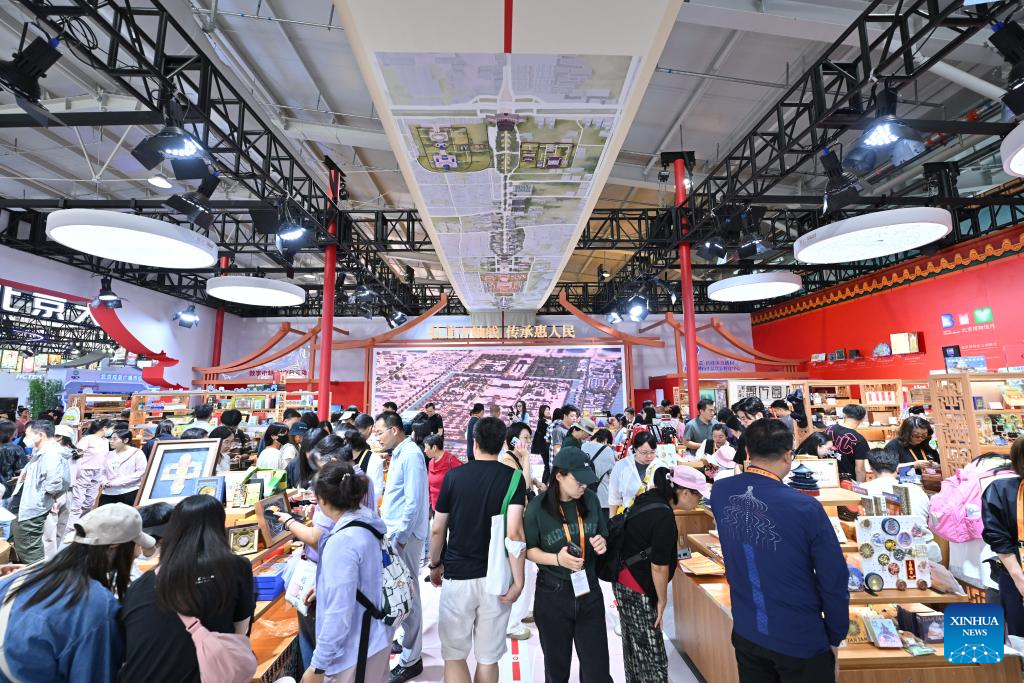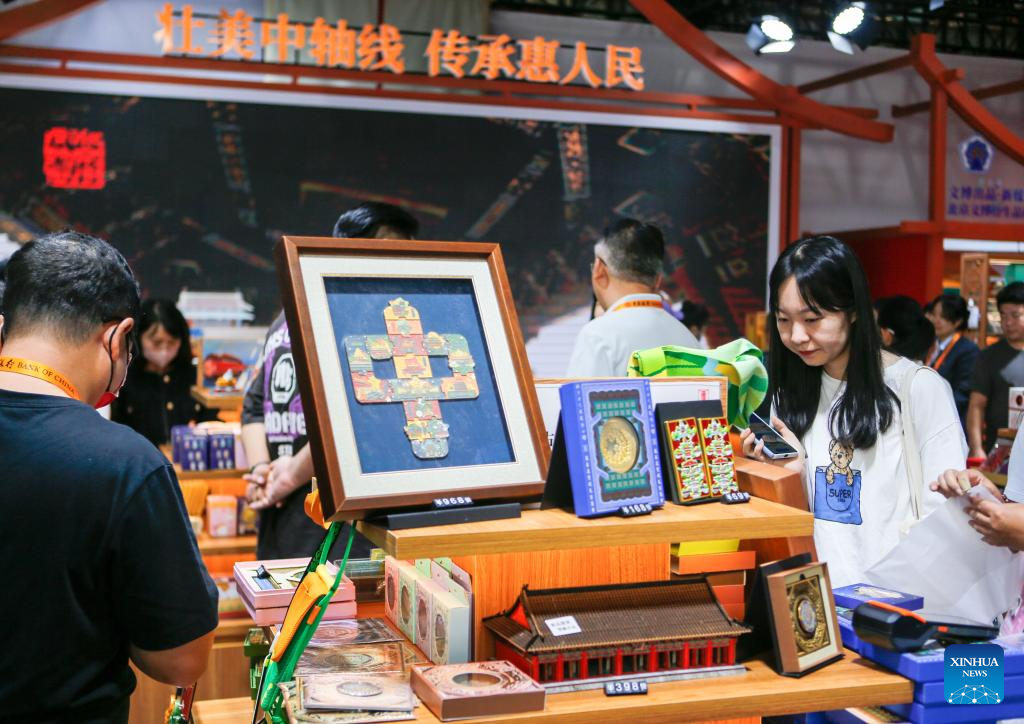 Visitors select cultural creative products themed on the Beijing Central Axis during the 2024 China International Fair for Trade in Services (CIFTIS) in the Cultural &Tourism Service thematic exhibition area at the Shougang Park in Beijing, capital of China, Sept. 16, 2024. The Cultural &Tourism Service thematic exhibition area of this year's CIFTIS reflects the integration of technology and culture. The exhibitions enable multidimensional presentations with new technologies such as immersive digital spaces, virtual reality (VR), augmented reality (AR), and holographic projection. (Xinhua/Ding Hongfa)