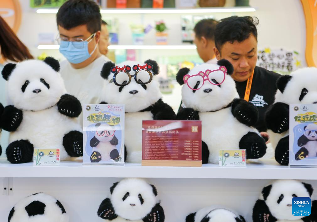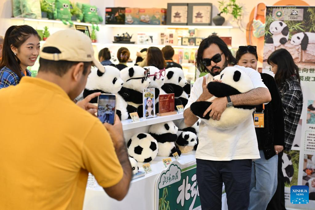 Visitors select giant panda dolls during the 2024 China International Fair for Trade in Services (CIFTIS) in the Cultural &Tourism Service thematic exhibition area at the Shougang Park in Beijing, capital of China, Sept. 16, 2024. The Cultural &Tourism Service thematic exhibition area of this year's CIFTIS reflects the integration of technology and culture. The exhibitions enable multidimensional presentations with new technologies such as immersive digital spaces, virtual reality (VR), augmented reality (AR), and holographic projection. (Xinhua/Ding Hongfa)