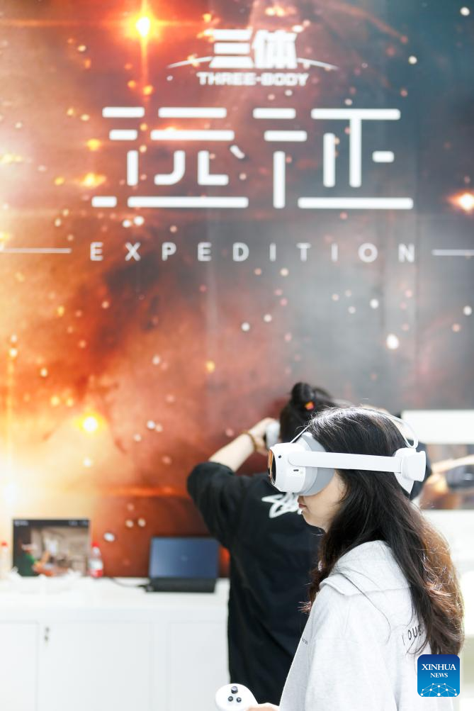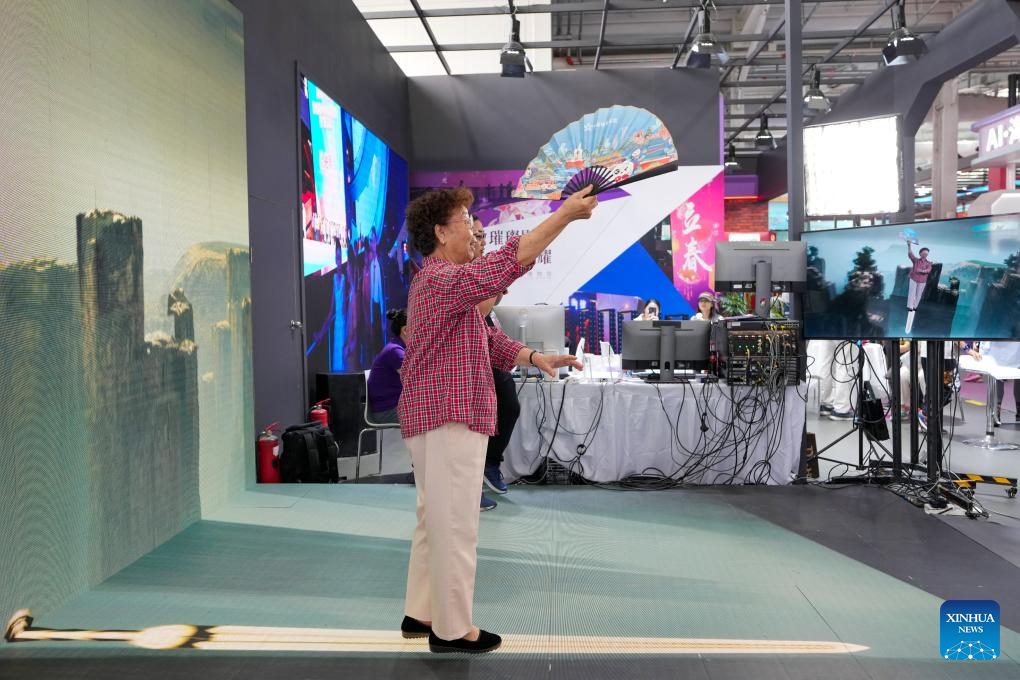A visitor experiences extended reality (XR) virtual imaging during the 2024 China International Fair for Trade in Services (CIFTIS) in the Cultural &Tourism Service thematic exhibition area at the Shougang Park in Beijing, capital of China, Sept. 15, 2024. The Cultural &Tourism Service thematic exhibition area of this year's CIFTIS reflects the integration of technology and culture. The exhibitions enable multidimensional presentations with new technologies such as immersive digital spaces, virtual reality (VR), augmented reality (AR), and holographic projection. (Xinhua/Ju Huanzong)