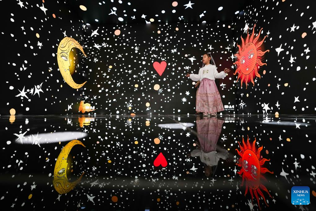 A child immerses herself in a digital art exhibition during the 2024 China International Fair for Trade in Services (CIFTIS) in the Cultural &Tourism Service thematic exhibition area at the Shougang Park in Beijing, capital of China, Sept. 15, 2024. The Cultural &Tourism Service thematic exhibition area of this year's CIFTIS reflects the integration of technology and culture. The exhibitions enable multidimensional presentations with new technologies such as immersive digital spaces, virtual reality (VR), augmented reality (AR), and holographic projection. (Xinhua/Ju Huanzong)