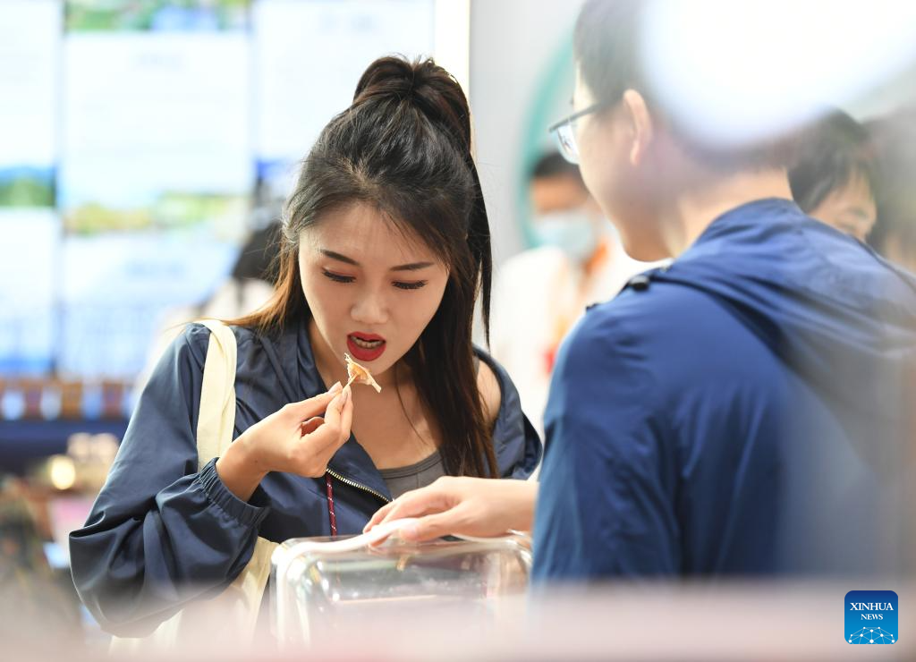 A visitor tastes roast chicken during the 2024 China International Fair for Trade in Services (CIFTIS) in the Cultural &Tourism Service thematic exhibition area at the Shougang Park in Beijing, capital of China, Sept. 16, 2024. The Cultural &Tourism Service thematic exhibition area of this year's CIFTIS reflects the integration of technology and culture. The exhibitions enable multidimensional presentations with new technologies such as immersive digital spaces, virtual reality (VR), augmented reality (AR), and holographic projection. (Xinhua/Lu Yang)