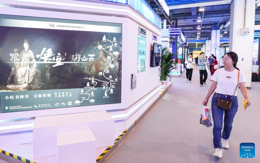 Visitors walk pass the booth of Shanxi Province during the 2024 China International Fair for Trade in Services (CIFTIS) at the China National Convention Center in Beijing, capital of China, Sept. 16, 2024. The Cultural &Tourism Service thematic exhibition area of this year's CIFTIS reflects the integration of technology and culture. The exhibitions enable multidimensional presentations with new technologies such as immersive digital spaces, virtual reality (VR), augmented reality (AR), and holographic projection. (Xinhua/Chen Yehua)