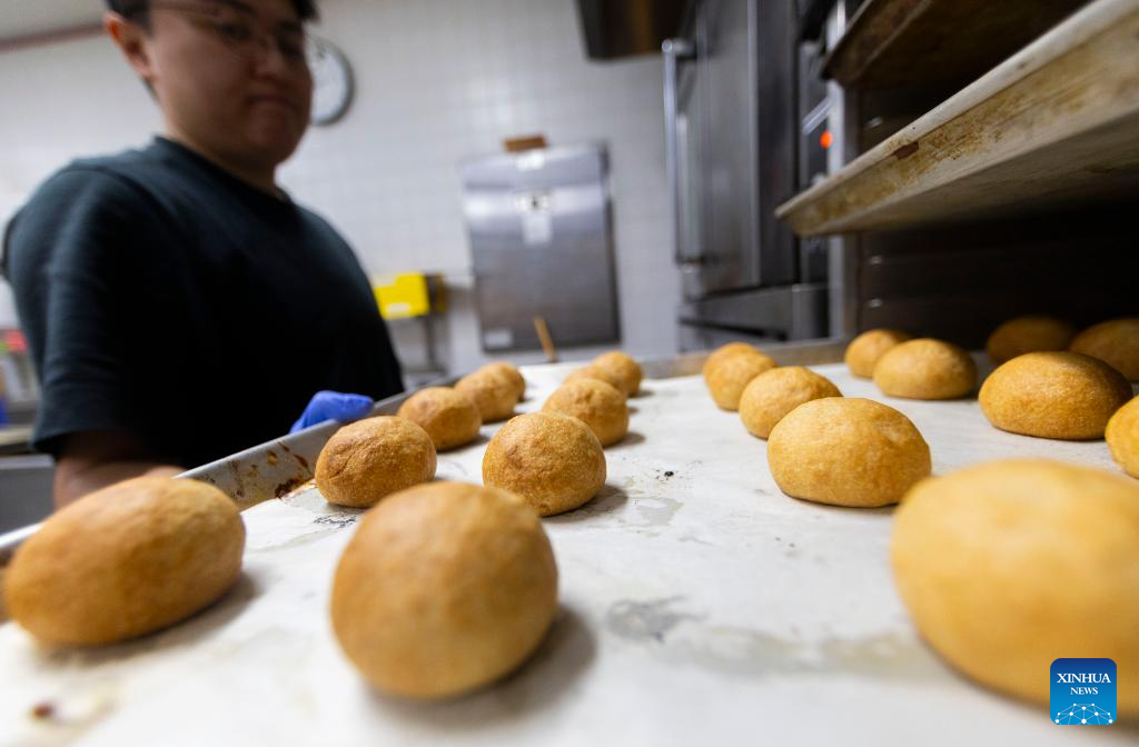 A baker arranges freshly baked ham mooncakes at a workshop in Toronto, Canada, on Sept. 15, 2024. The Chinese Mid-Autumn Festival falls on Sept. 17 this year. (Photo by Zou Zheng/Xinhua)