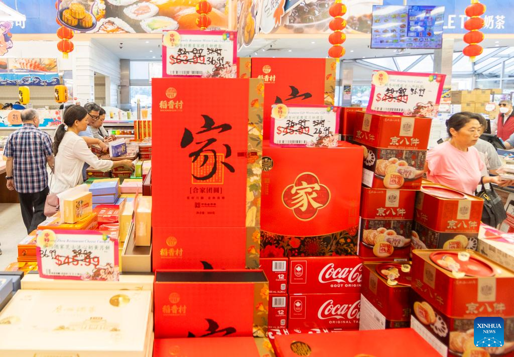 Customers shop for mooncakes ahead of the Mid-Autumn Festival at a supermarket in Toronto, Canada, on Sept. 15, 2024. The Chinese Mid-Autumn Festival falls on Sept. 17 this year. (Photo by Zou Zheng/Xinhua)