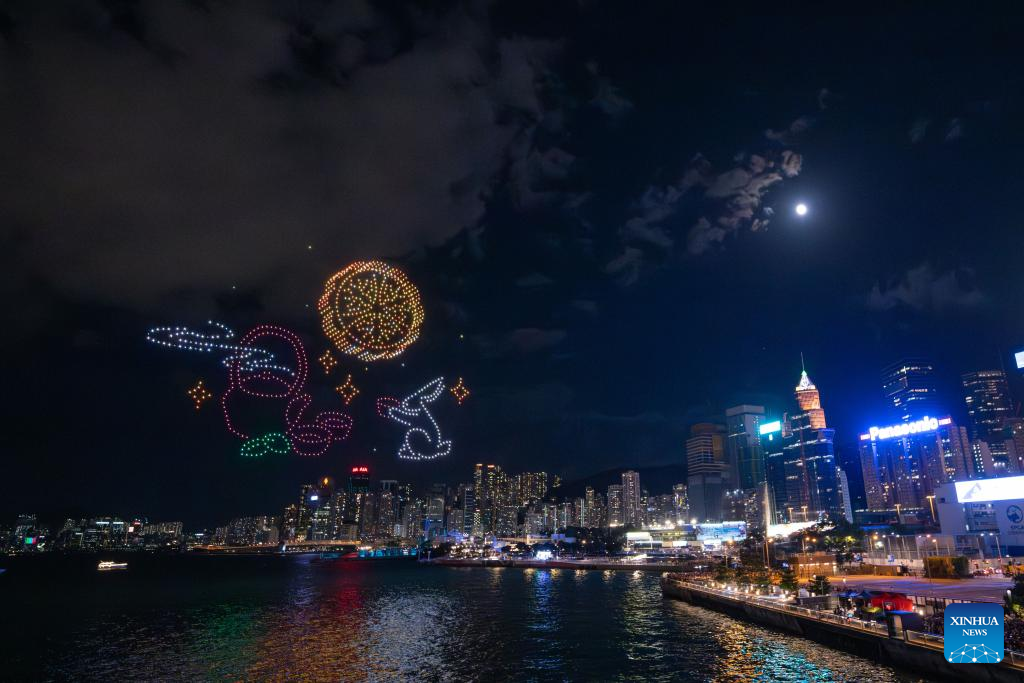 HONG KONG, Sept. 17 (Xinhua) -- Rabbits, moon cakes, red lanterns, fire dragon...a drone show was staged above Hong Kong's Victoria Harbor on Tuesday evening, with 1,000 drones weaving multi-screen Mid-Autumn festival scenes to convey holiday blessings.