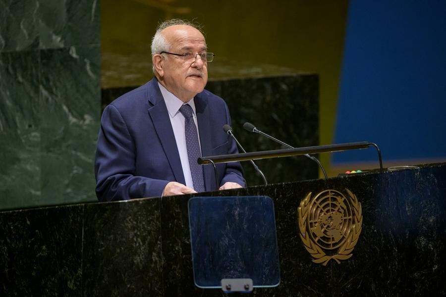 Riyad Mansour, the permanent observer of the State of Palestine to the United Nations, addresses a meeting of the UN General Assembly (UNGA) discussing the U.S. veto on Gaza in the Security Council the previous month, at the UN headquarters in New York, Jan. 9, 2024. (Manuel Elias/UN Photo/Handout via Xinhua)
