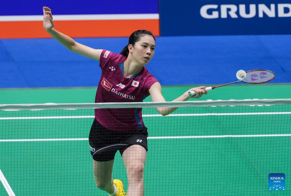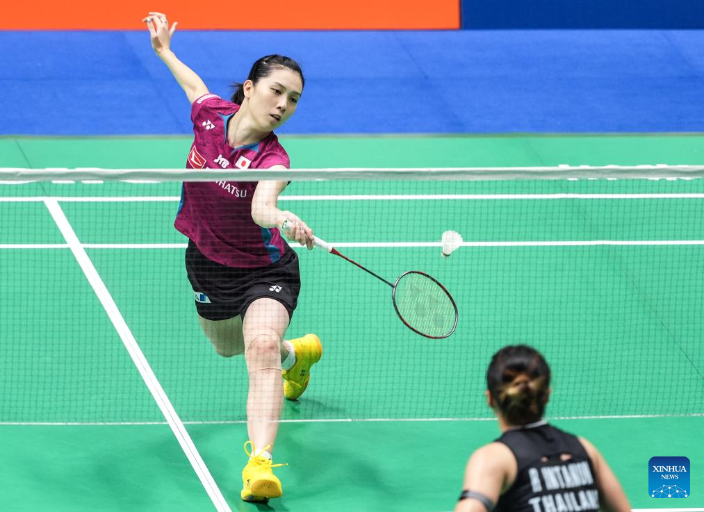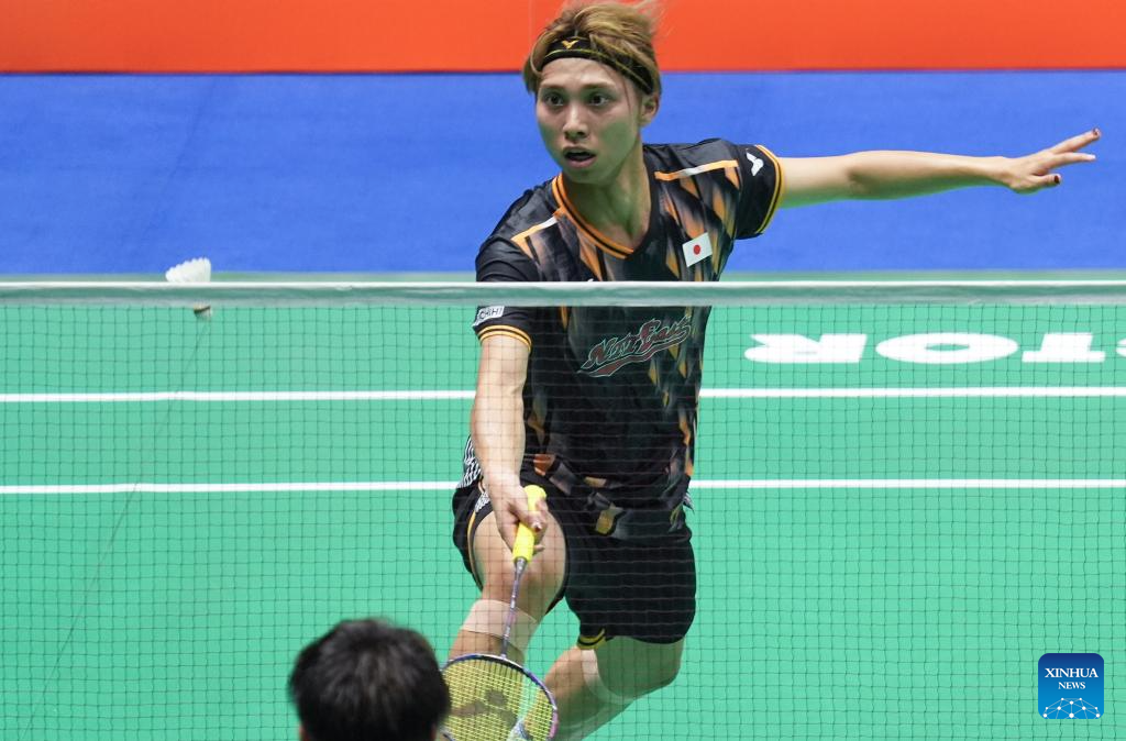 Ohori Aya of Japan hits a return during the women's singles 1st round match against Ratchanok Intanon of Thailand at the China Open 2024 badminton tournament in Changzhou, east China's Jiangsu Province, Sept. 17, 2024. (Xinhua/Yang Lei)