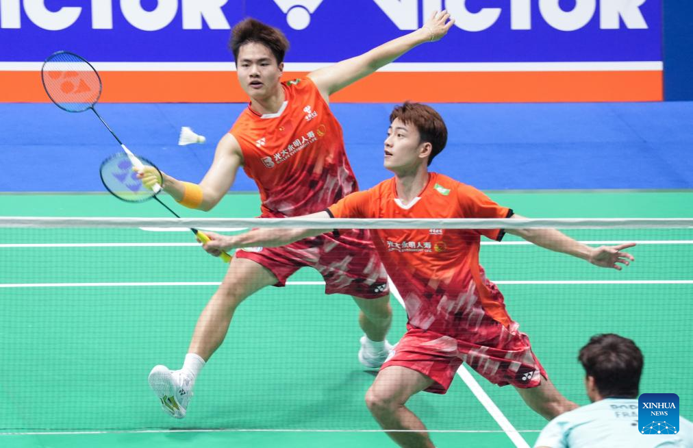 Liang Weikeng/Wang Chang (R) of China compete during the men's doubles first round match between Liang Weikeng/Wang Chang of China and Christo Popov/Toma Junior Popov of France at China Open 2024 badminton tournament in Changzhou, east China's Jiangsu Province, Sept. 17, 2024. (Xinhua/Yang Lei)