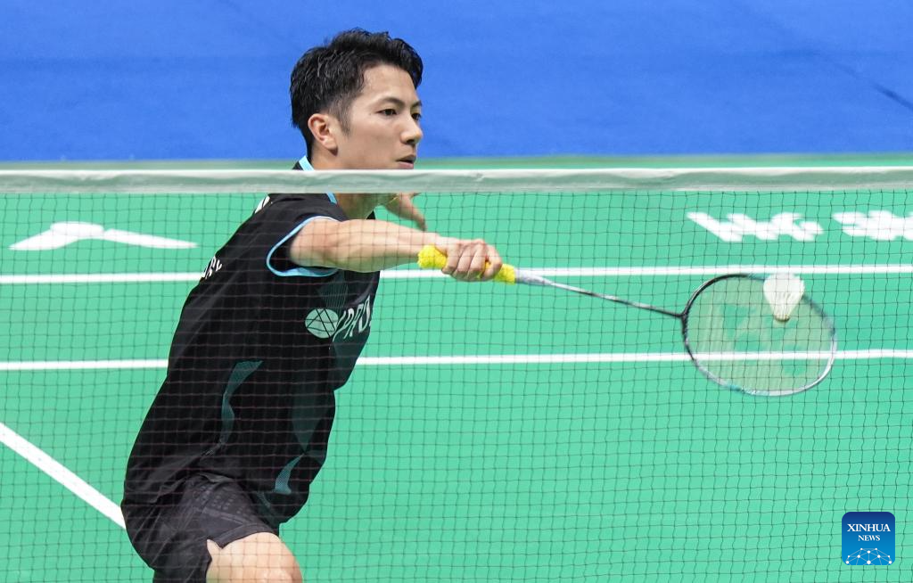 Watanabe Koki of Japan hits a return to Lee Zii Jia of Malaysia during the men's singles 1st round match at the China Open 2024 badminton tournament in Changzhou, east China's Jiangsu Province, Sept. 17, 2024. (Xinhua/Yang Lei)